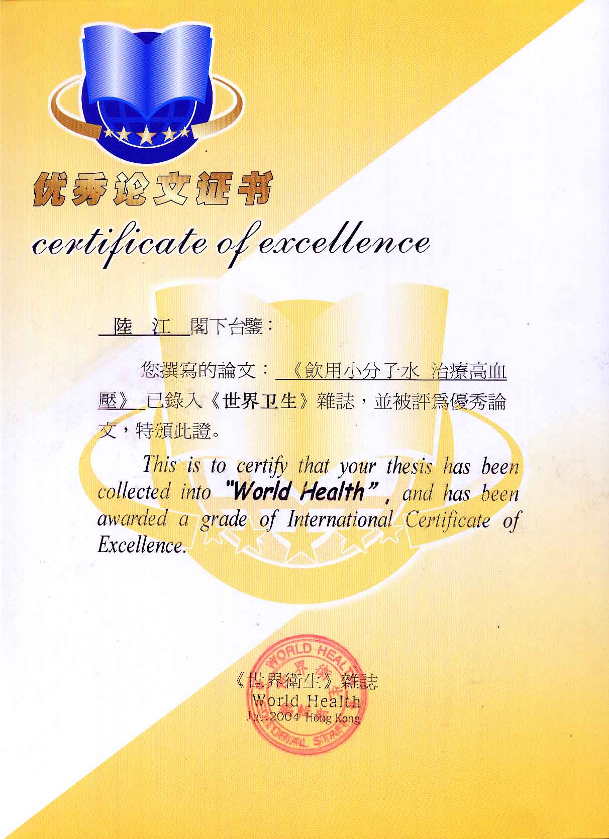 一、創造了在家在職場使用方便的微小分子團水器具。在世界上首先用此理療方法,大規模地成功地逆轉和消除動脈粥樣硬化,確實祛俆高血壓和冠心病與糖尿病,使患者恢復動脈和心臟及胰島的健康,可消除因細胞缺水使器官衰弱而形成多種器官的缺水性病癥,并使健康人可預防和減緩動脈粥樣硬化,減少心腦血管病,具有重大的社會經濟和戰略意義。