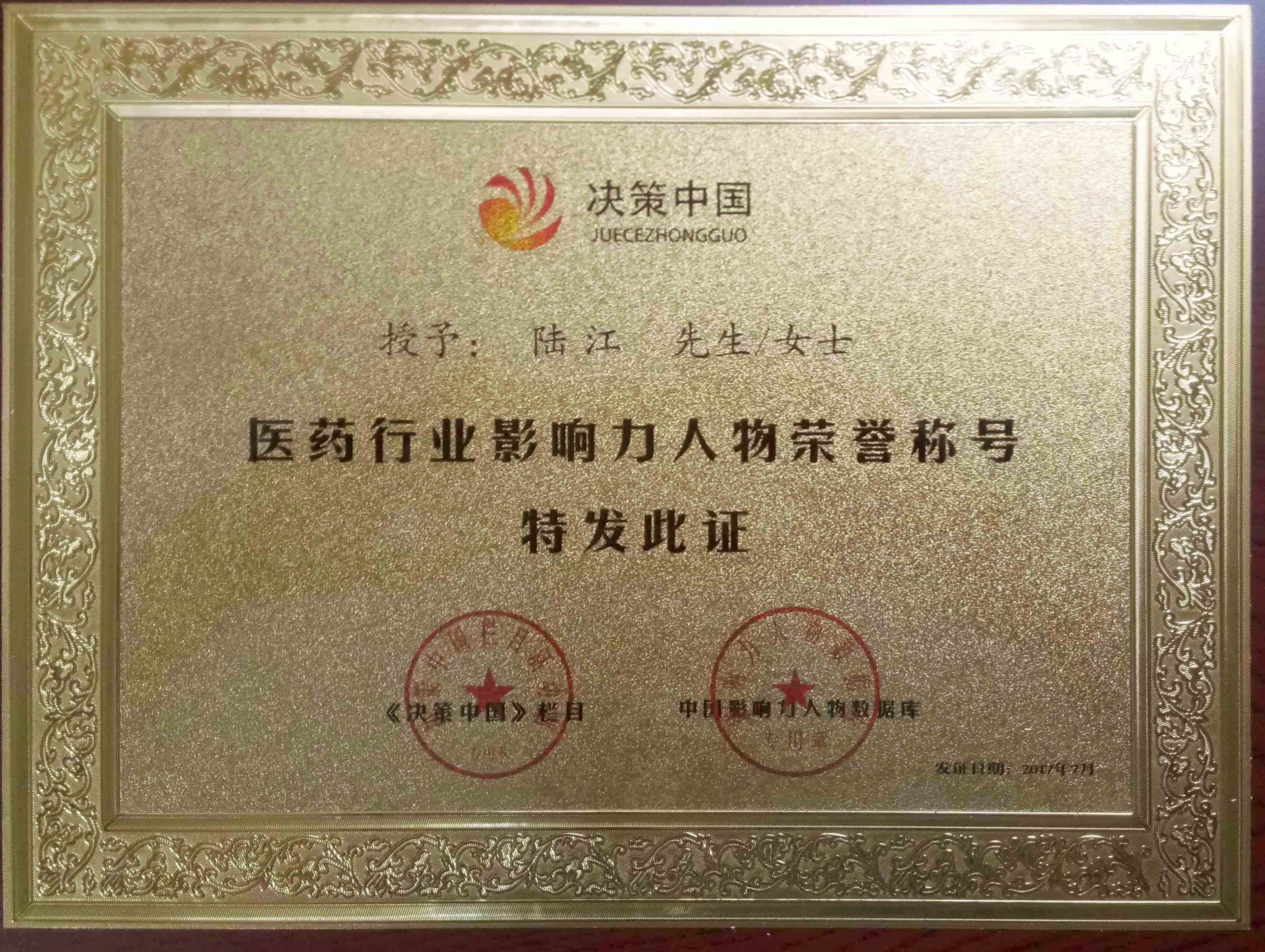 陸江榮獲引領行業發展杰出貢獻人物證書 --------卓康公司榮獲全國質量、服務、信譽AAA級品牌證書