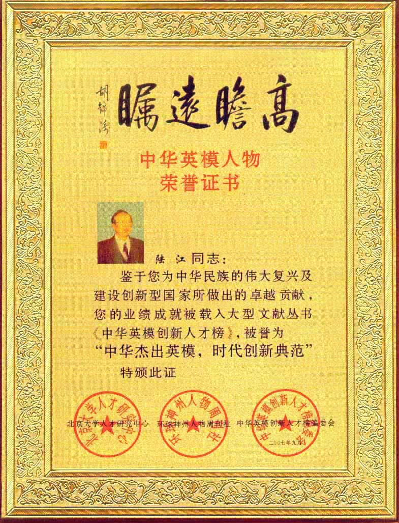 陸江的論文獲一等獎榮譽證書-- 陸江論文獲創新論文獎牌
